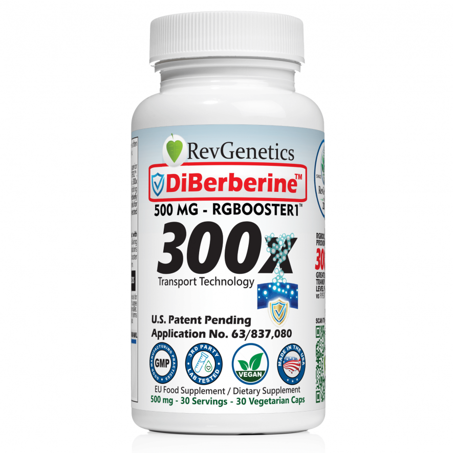 Manufactured in the USA in a cGMP-certified, third-party tested facility, DiBerberine 300x is now available at revgenetics.com. A 30-day supply (30 enteric capsules) is priced at $44.95.